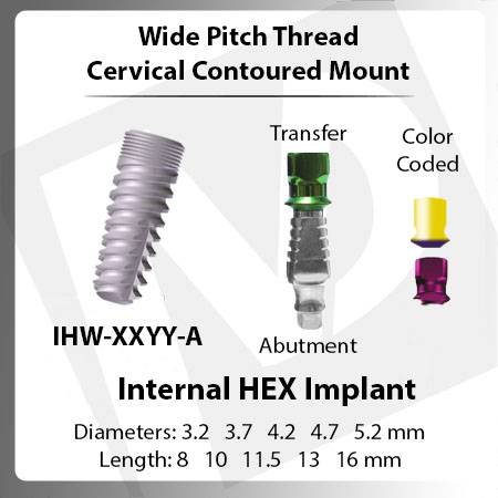 Parlay Implants come in a wide range of designs and sizes. Our implants are packaged to include the implant, cover screw, straight abutment/transfer combination, and an abutment screw. This simplifies the process for the surgeon and the lab. They come in a narrow and wide threads. The Abutments comes in regular and cervical designs.